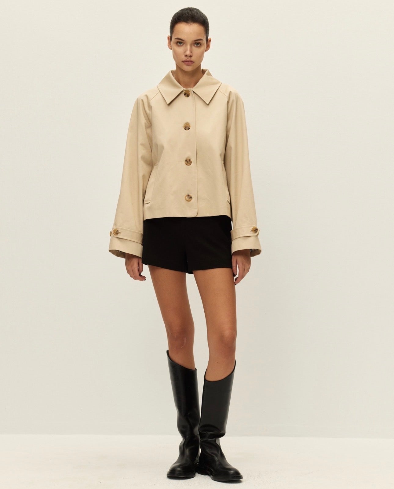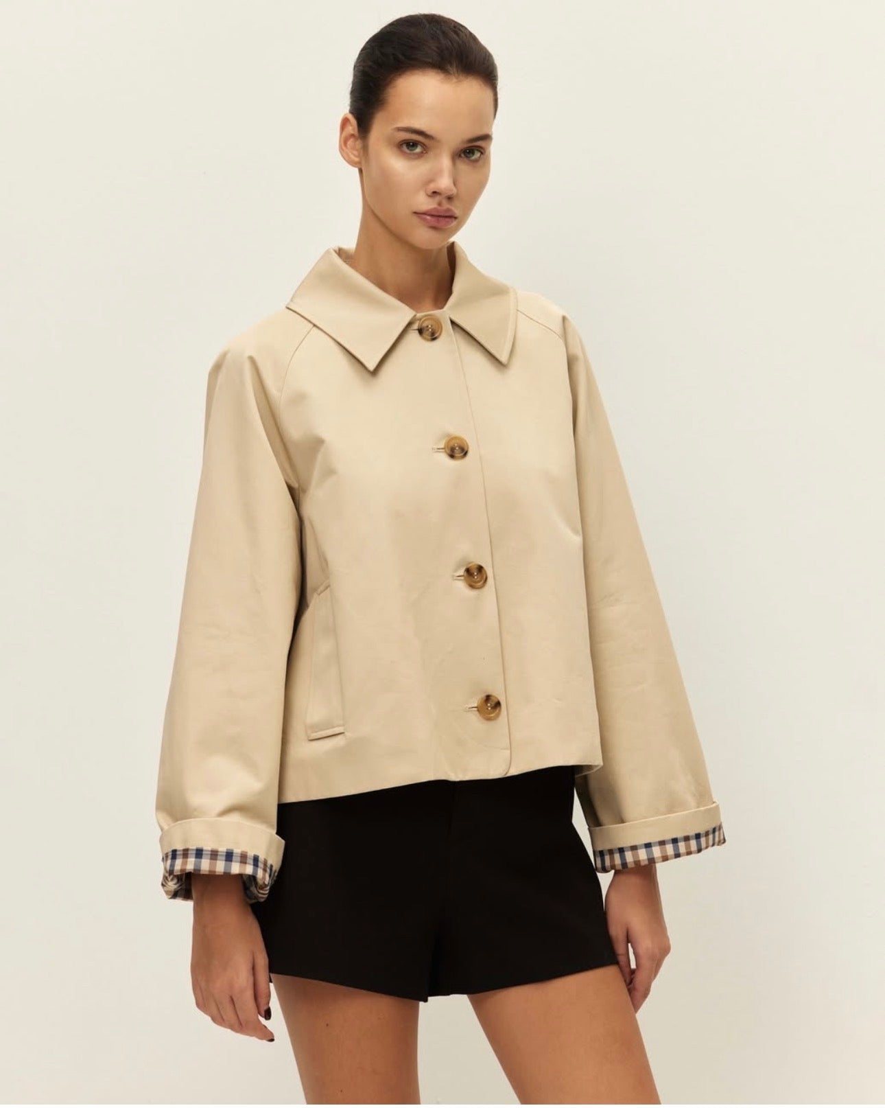 The trench you need for Spring and honestly maybe all year round. Lightweight, light khaki color, plaid inside, front buttons, slightly oversized fit. Simple enough to wear everyday with a flattering and trendy silhouette.