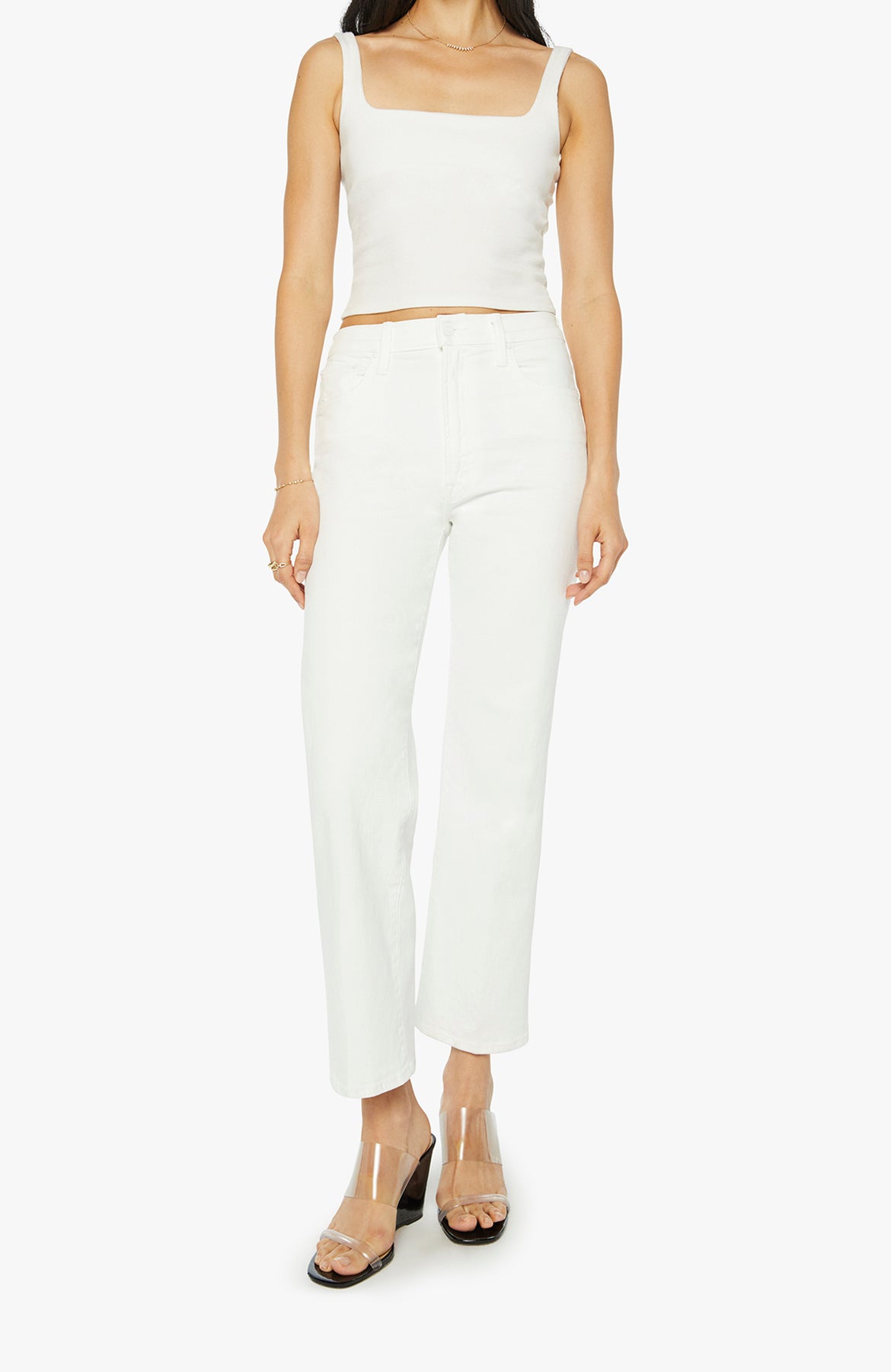 An expanded collection of foundational pieces designed for All Day, Every Day. Created for versatility, layering, and year-round wearability, these are the pieces you will never stop reaching for. High-waisted jeans with a wide straight leg, zip fly and clean ankle-length inseam. Made from stretch denim, Fairest Of Them All is our bestselling white wash.