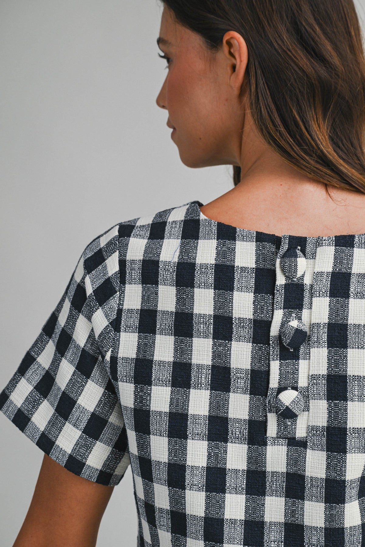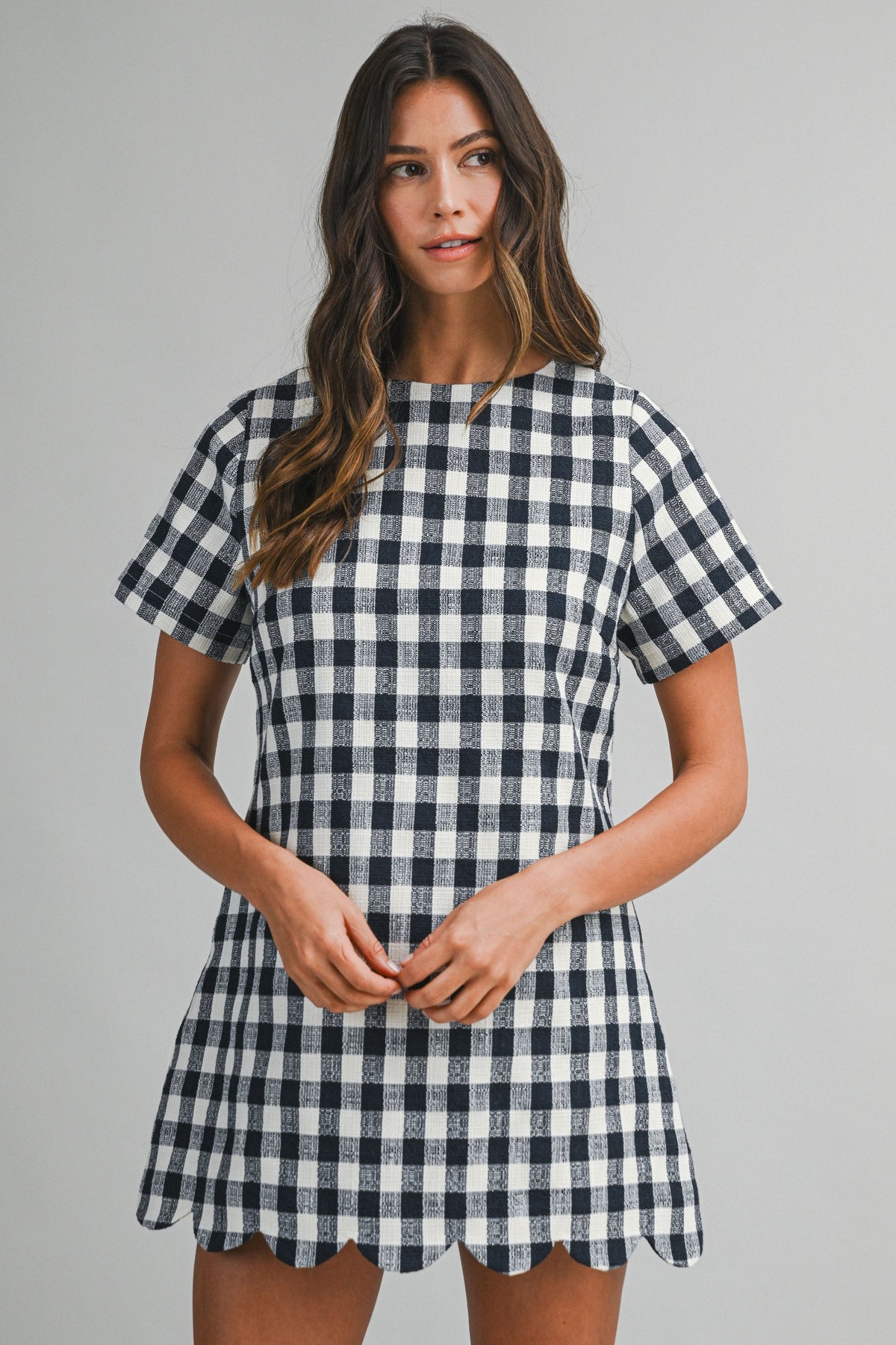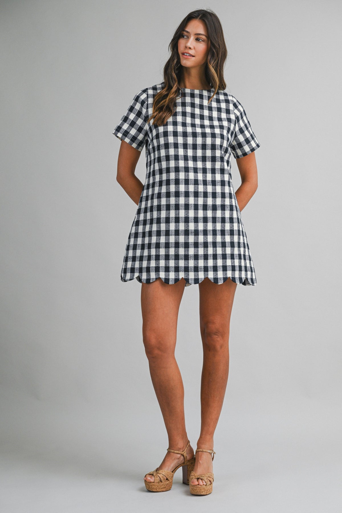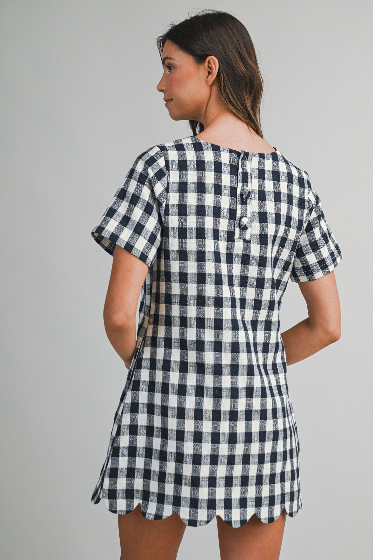 A timeless classic with a modern twist. This navy and white gingham mini dress features a clean, structured silhouette with short sleeves and a subtle A-line fit that’s both flattering and easy to wear. The scalloped hem adds a feminine, elevated touch, making this piece feel polished yet playful. Lightweight and breathable, it’s perfect for warm-weather days, brunch dates, vacations, or casual events. Style it with heels for a dressed-up look or sneakers for effortless everyday chic.
